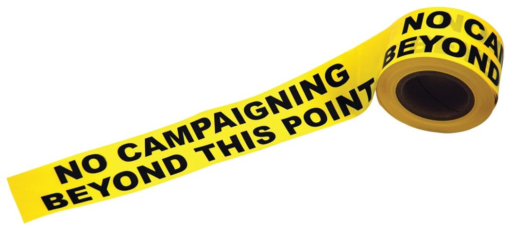 Bright yellow, specially printed tape reads “NO CAMPAIGNING BEYOND THIS POINT”